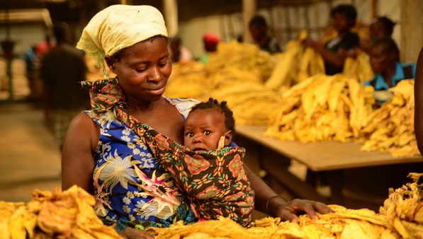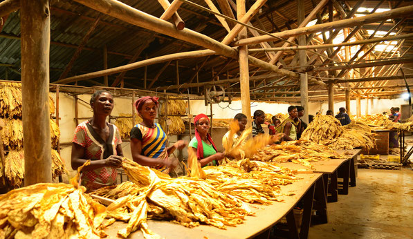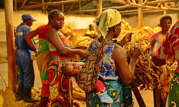 Frauen tragen die getrockneten Blätter auf die Sortiertische, auf denen sie nach Farbe sortiert werden. Danach werden sie in 60 Kg schwere „Pakete“ gepresst, verpackt und nach Dar es Salaam gebracht von dort mit Frachtschiffen nach China transportiert. Die Farm beschäftigt je nach Saison ca. 120 Personen. Patrick kam mit seiner Familie 1984 von Simbabwe nach Sambia, als er sich als weißer, im eigenen Land von Mugabe. nicht mehr sicher fühlte. Er pachtete in der Nähe von Choma, ein Stück Land mit über 8 KM² auf dem er wechselweise Tabak und Mais anpflanzt. Heute ist er mit seiner Familie ein einflussreicher Tabakfarmer in Sambia.
