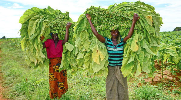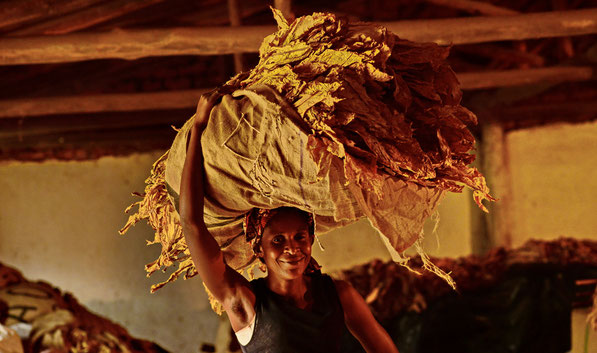 Tabakernte ist harte Arbeit: Frauen Sammeln die in Doppel- Stäben geklemmten Tabakblätter ein und tragen sie (bis zu 60 Kg) zu dem Traktor Hänger. (siehe Video)