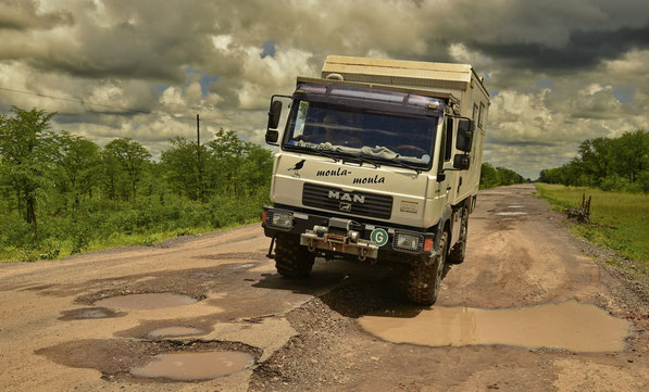 Die Strecke von der Grenze zu den Viktoria Wasserfällen ist auf einer Länge von über 100 Km in einem desolaten Zustand. Mal abwarten, ob unsere Straßengebühren in absehbarer Zeit etwas bewegen können….