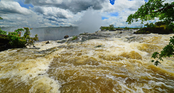 Der wasserreiche, donnernde Sambesi an der Fallkante der Viktoria-Fälle.