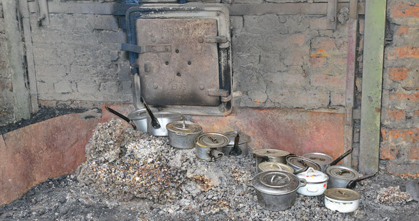 Das Mittagessen der Farmarbeiter wird auf heißer Asche-Schlacke am Trockenofen aufgewärmt.